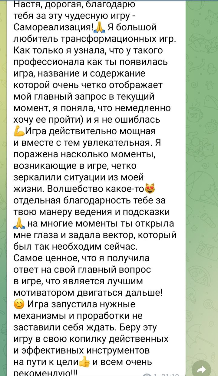 Друзья, 10 декабря (сб) в 15.00 мск и 11 декабря (вс) в 19.00 мск приглашаю вас поиграть в очень мощную трансформационную игру "Самореализация"